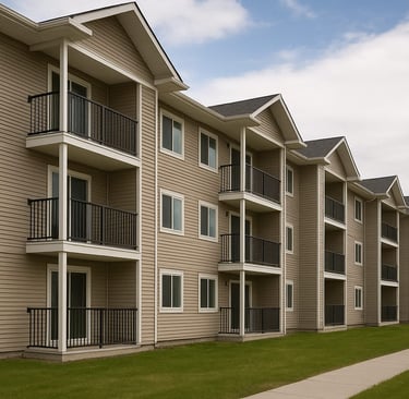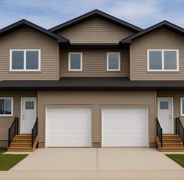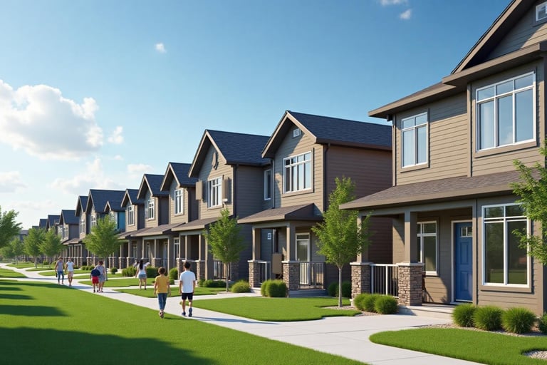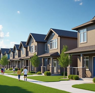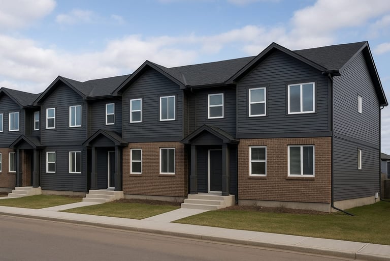 A multi-floor affordable home that shares one or two walls with neighboring units but has its own entrance. Offers a balance between affordability and space.